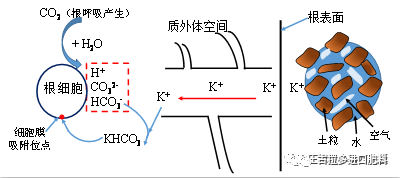 根表面的离子通过质外体(细胞壁和细胞间隙等空间构成)途径到达根细胞膜上,并且与根细胞表面的离子(H+和HCO3-,由根呼吸产生)发生交换,并吸附在细胞膜上的吸附位点,如图4。