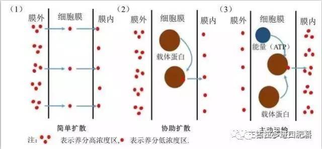 (3)主动运输是离子逆浓度梯度从低浓度区运输到高浓度区,植物吸收矿质养分主要就依靠这种运输方式。进行此过程需要载体和能量。