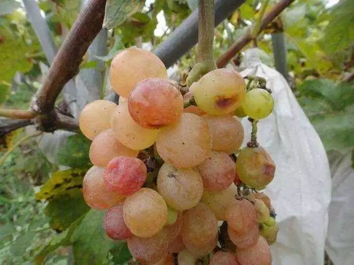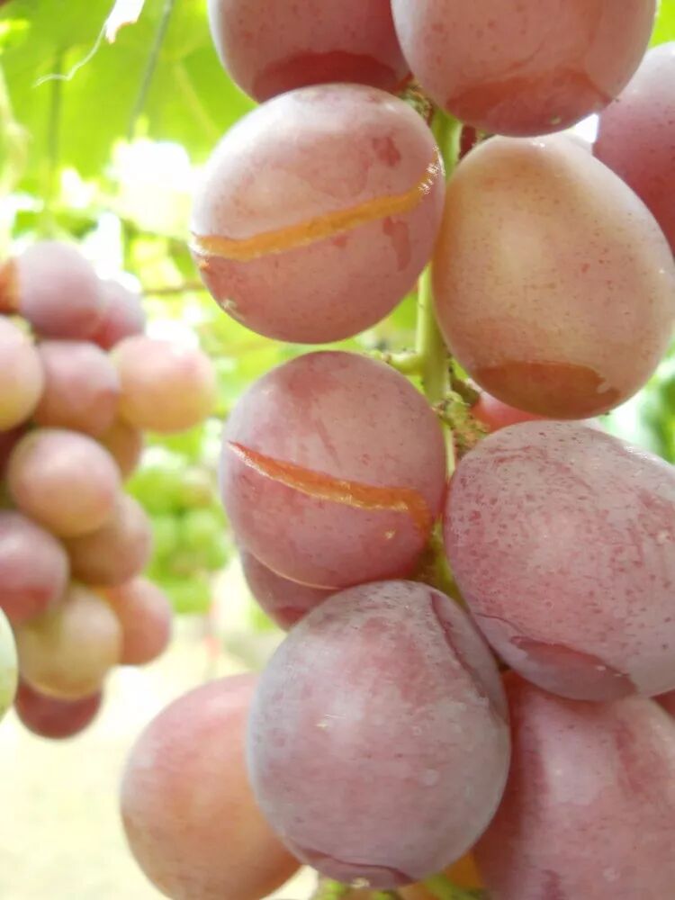 另外,前期高温干旱而后期突然降雨,会导致葡萄果肉细胞大量吸收水分,导致水分失衡,对于易裂果和果穗穗形较紧密的葡萄品种,很容易造成裂果。(有葡友的看法:只有幼果期水分大,后期下雨后才会裂的少些。)