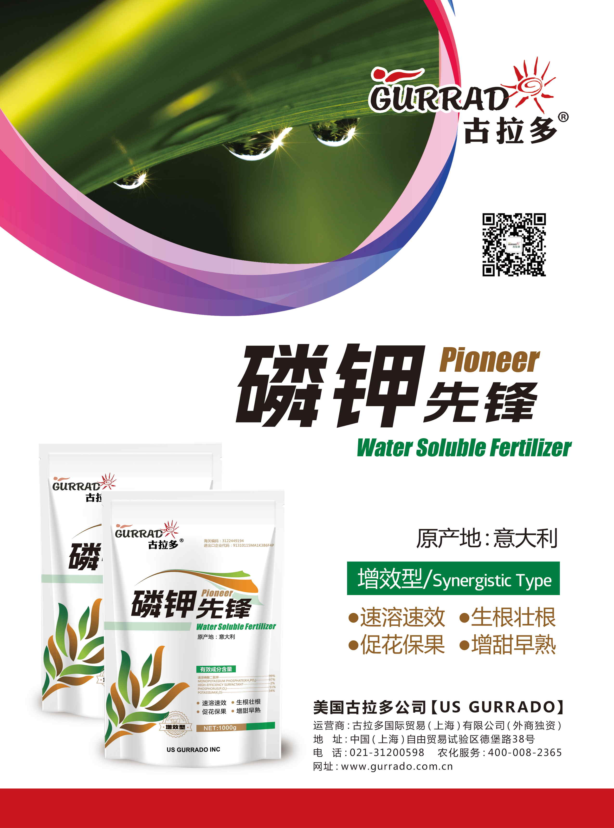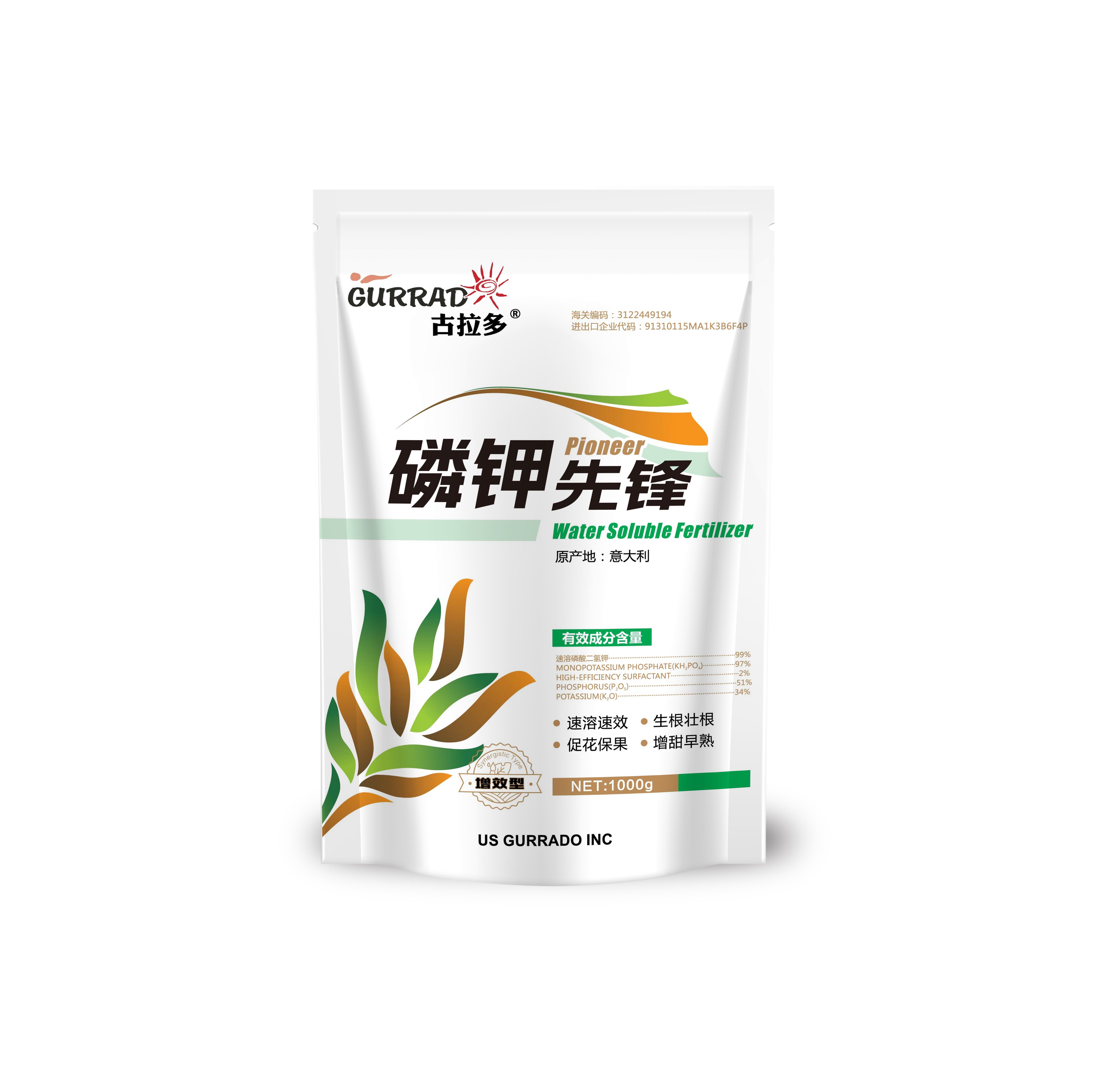 1、本产品采用古拉多公司发明增效专利技术(ZL201210212499.3),有效纯度高,不含有害重金属以及氯元素,不含激素,是一种安全的磷钾肥料。
